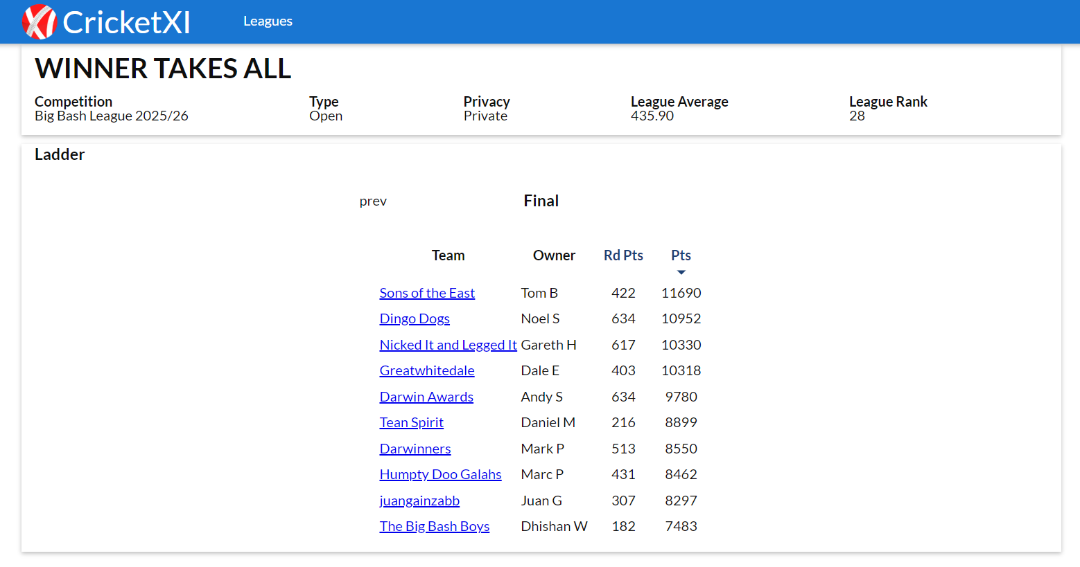 If you fancy joining in a future league look out for posts on this forum advertising such as I run leagues on IPL, One Day Cup, BBL, T20 Blast and County Championship to name a few plus internationally will be doing the forthcoming T20 World Cup starting in a week or so’s time.