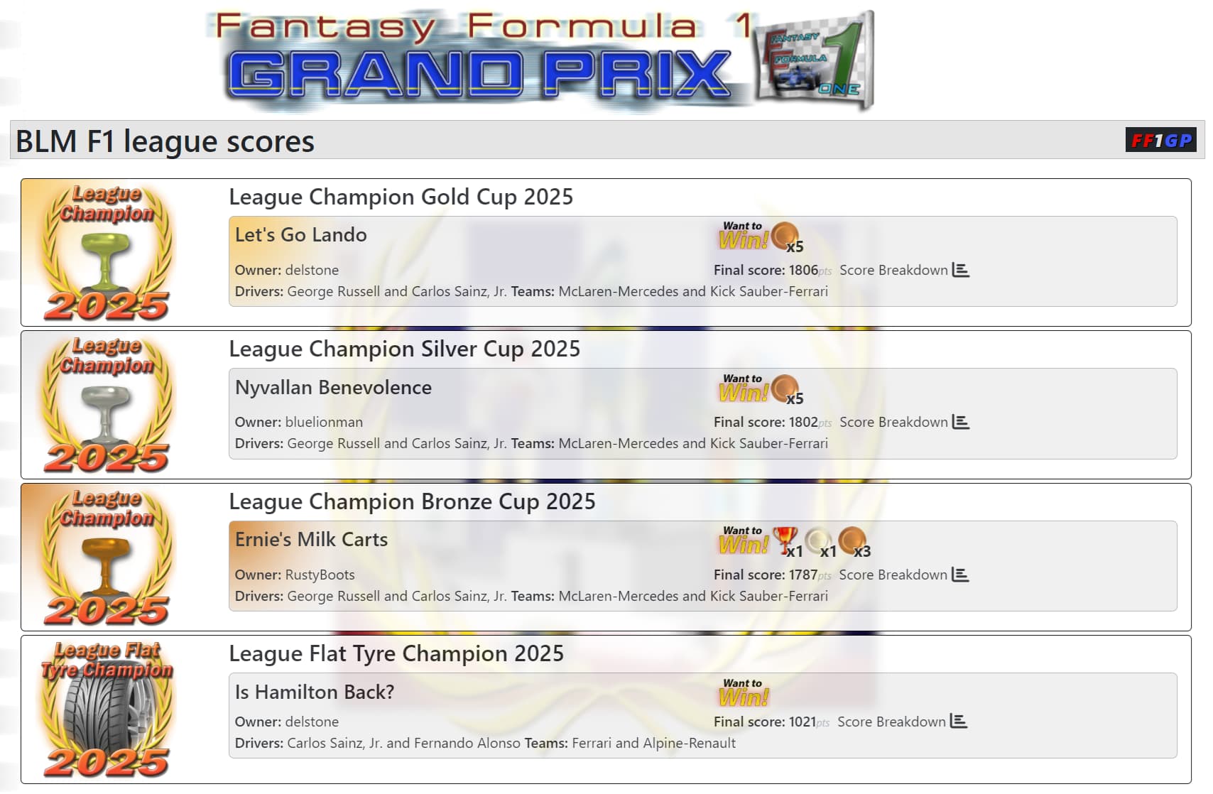 This leagues past winners history: Formula 1 Games
