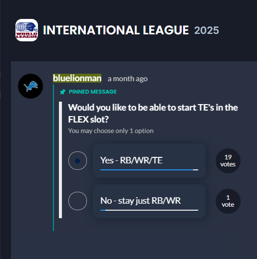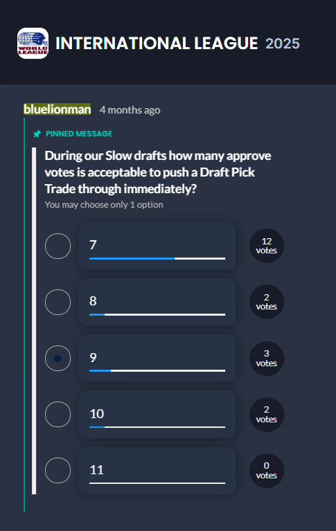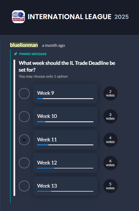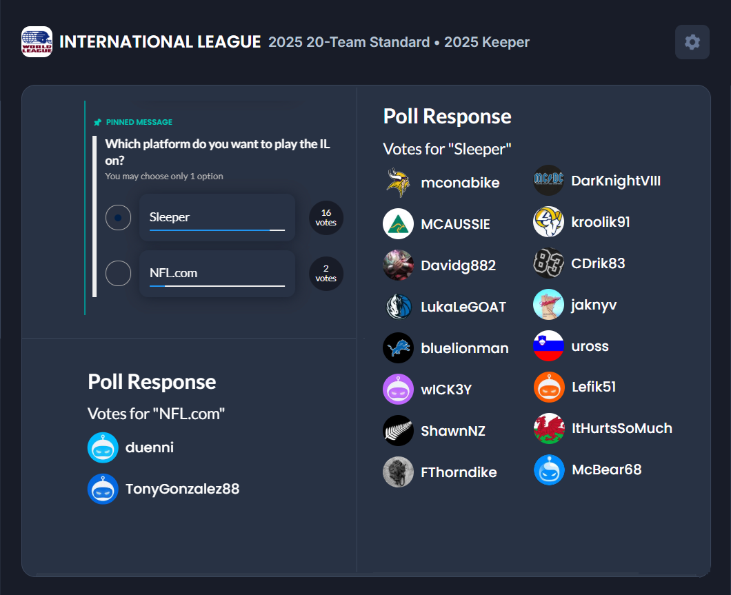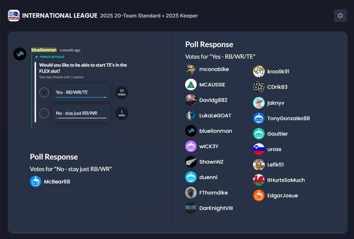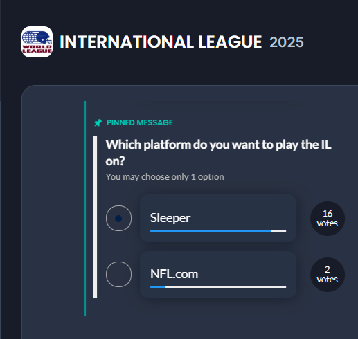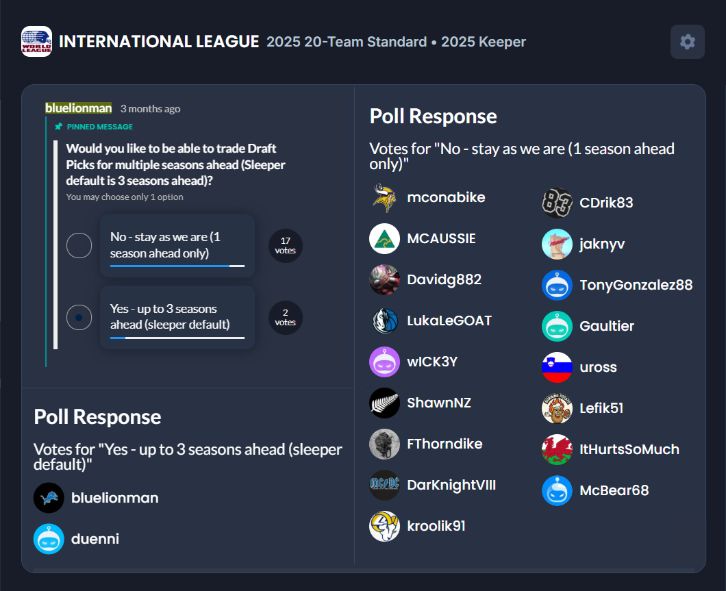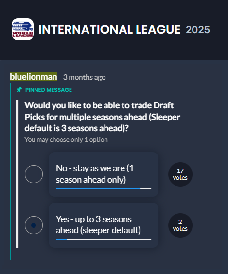 From the 2020 season onwards strikes also became issued for not being seen to vote in an official poll posted within the league and this rule will continue on Sleeper. The good thing is I can set up polls on Sleeper to show who has voted. It’s been the hardest thing for me as a commissioner to get people to engage with me on rules and proposals to do with the league like having a trade deadline, or changing a flex spot etc., so now it’s mandatory to partake in polls - and you only pick up a strike if you have not voted after 28 days - so no excuse really if your an active player! I dislike having to do this but for many seasons people have just not been engaging enough to help me shape the league by voting in polls so felt I had to do this so I can weed out and replace non committed GM’s with ones who buy into the ethos behind this custom International keeper league and make it fun and engaging for all of us.