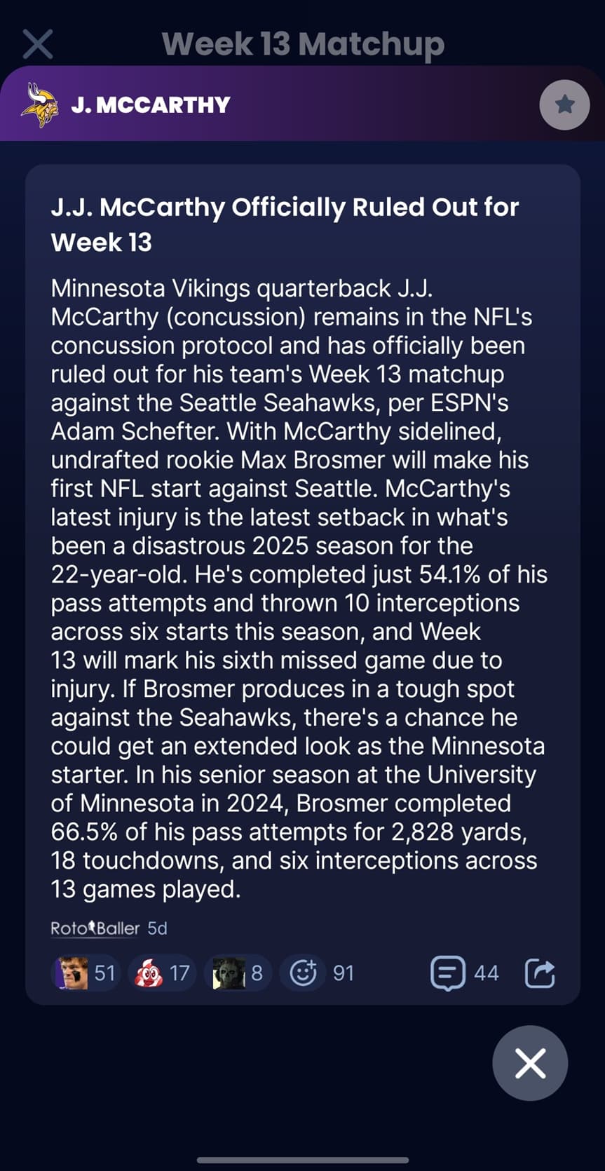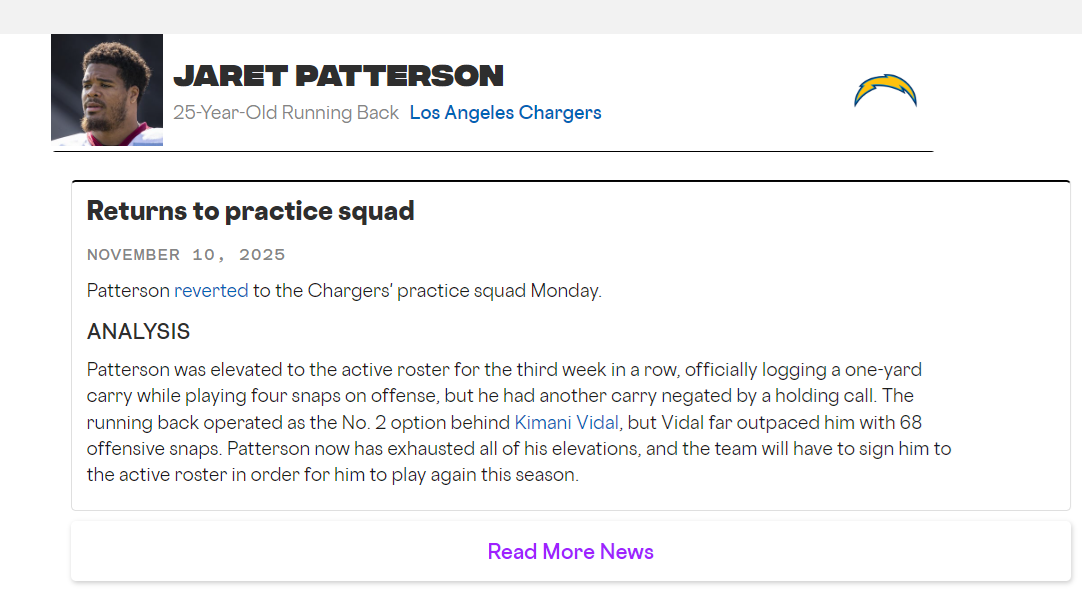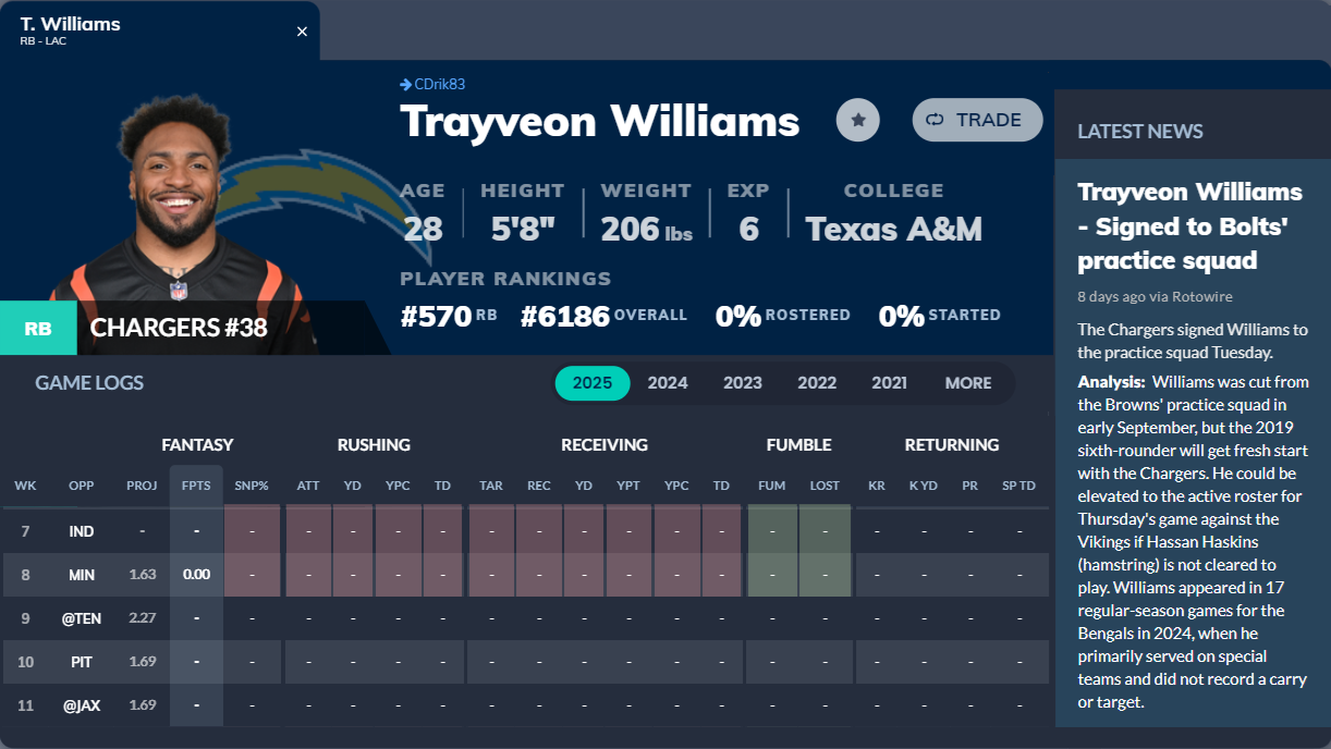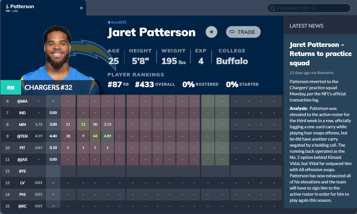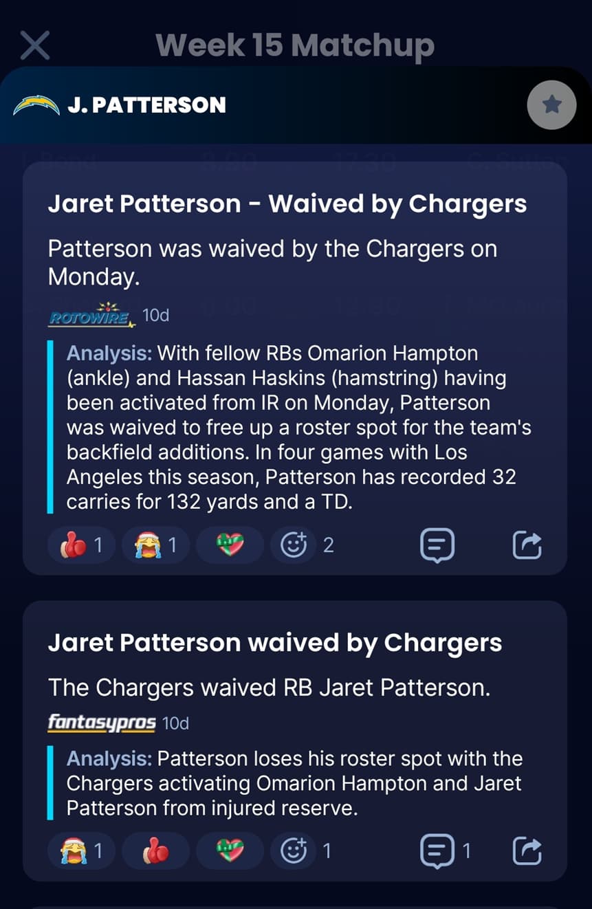 To check any of your players statuses just click on their name when on your team page and it brings up their player card with information about them - sadly on Sleeper the website and app differ from this point. Scrolling down on the app will show you recent news and below it, if you scroll down more, past updates with dates/times that info was published. Alas on the full website the player card only shows you the latest news - not any previous updates. So for strike checking purposes I will be having to use the app more and going back to NFL.com itself to see when news was published - and I will use both of these sources Roto wire player card updates for checking on players that appear not to have played in owners starting line ups and what I find is how I make a judgement on whether or not a strike is justified.