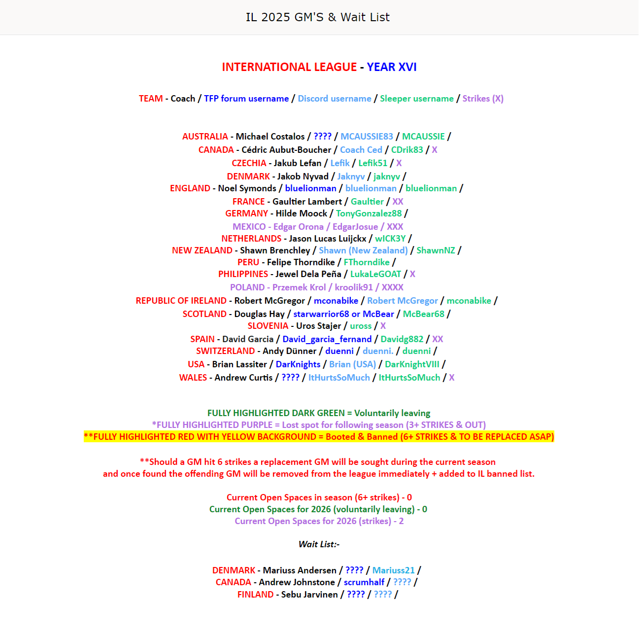 I wish for serious players that won’t quit during the season as it’s national pride at stake. I am ENGLAND and going nowhere so pointless going on the waiting list for. All other current countries in the league can be seen above. If you qualify and are interested to go on the reserve/waiting list then post on this thread telling me which country or countries you qualify for (and wish to manage). To qualify you must be born in or have at least one parent from that country.