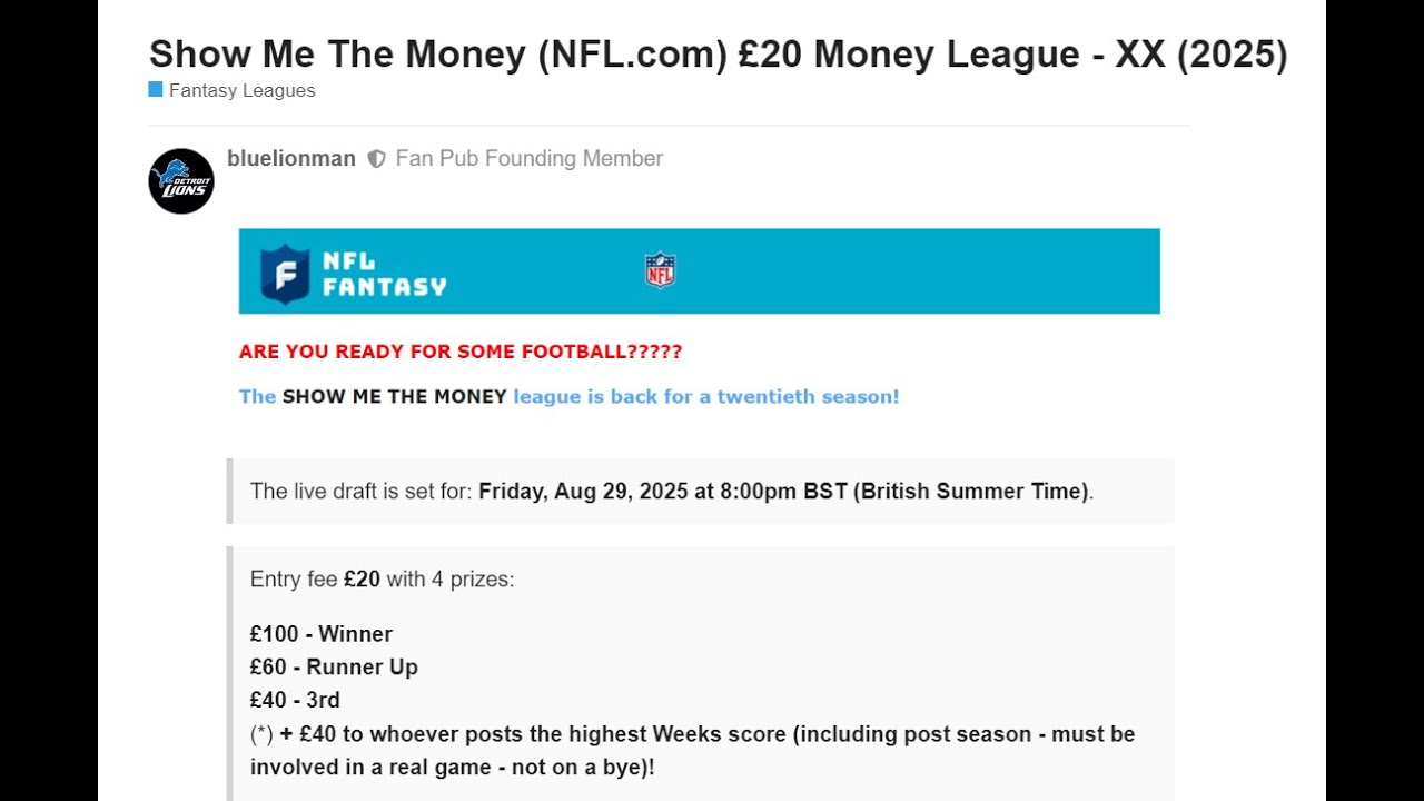 (*) + £40 to whoever posts the highest Weeks score (including post season - must be involved in a real game - not on a bye)!(*) This is a single prize paid at the end of the season and goes to whoever posts the highest one-off weekly score during the season (including play-offs / consolation bracket games - for those who make it). So even if you have a bad season and can’t make the championship play-offs proper you still have something to go for - set your line up weekly - post the top score of the season and you will get back double your entry fee.