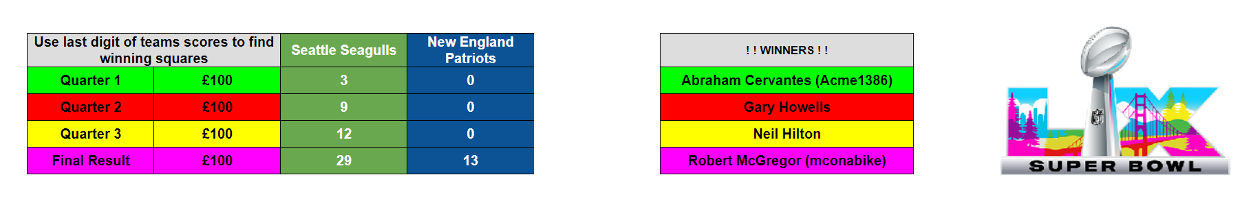 Now that’s out of the way let’s move on with the game mechanics - I know some of you might not like to read loads of text so here’s a link to a video I MADE FOR A PREVIOUS SUPER BOWL of me doing my best to explain how the Super Bowl Squares game works:
