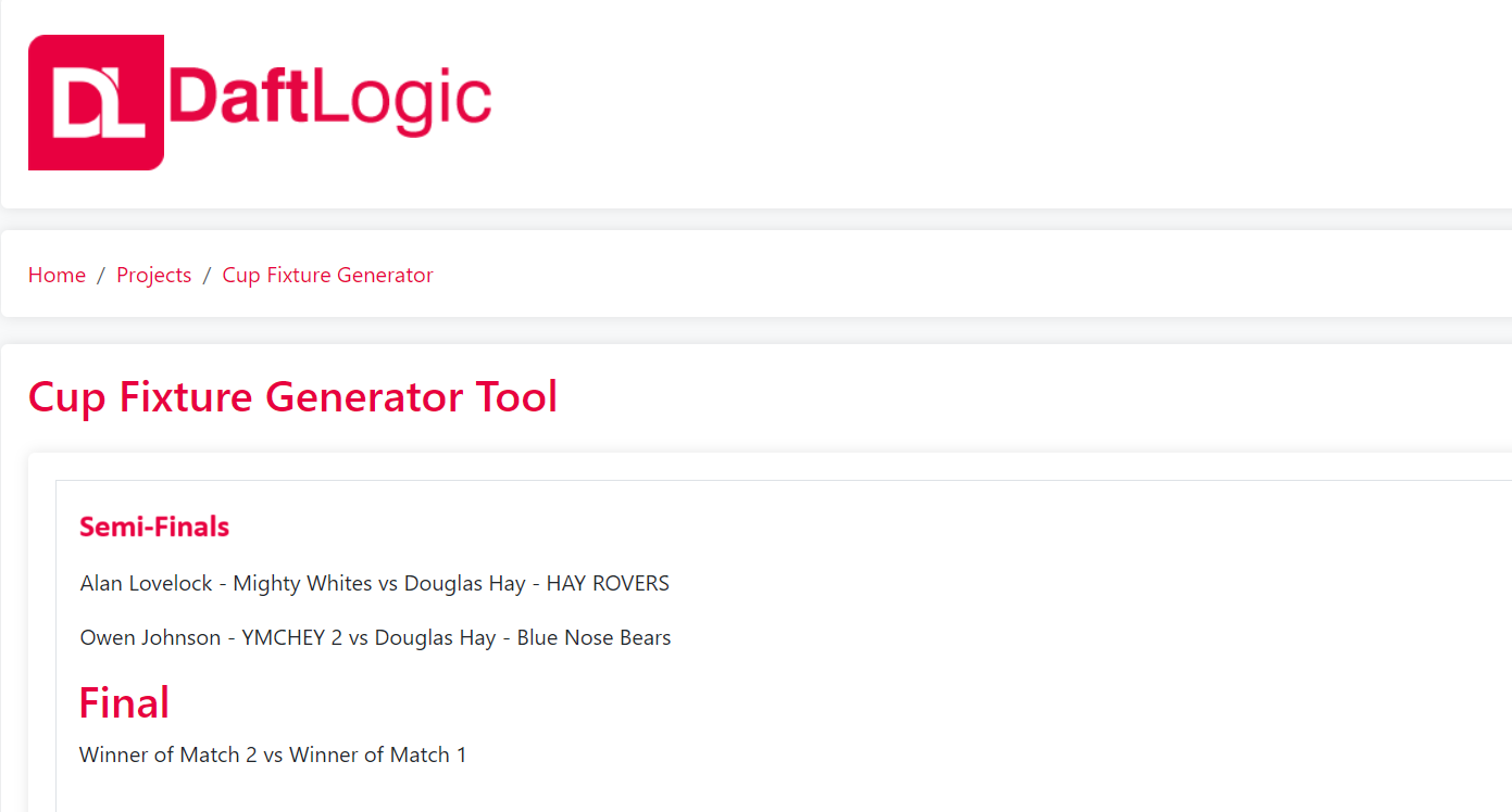Also, to make the 8 teams needed for the Quarter-finals there may be the need for the preceding round to be an all v all round between all the remaining teams left if there are not enough teams left to make separate games and still leave 8 teams afterwards. For instance, if I have 12 teams then separate games would leave me with only 6 teams so in this case it would be an all v all round with the 4 lowest scoring that Cup week going out and the remaining 8 going through to the Quarter-finals.
