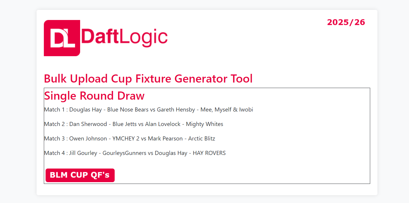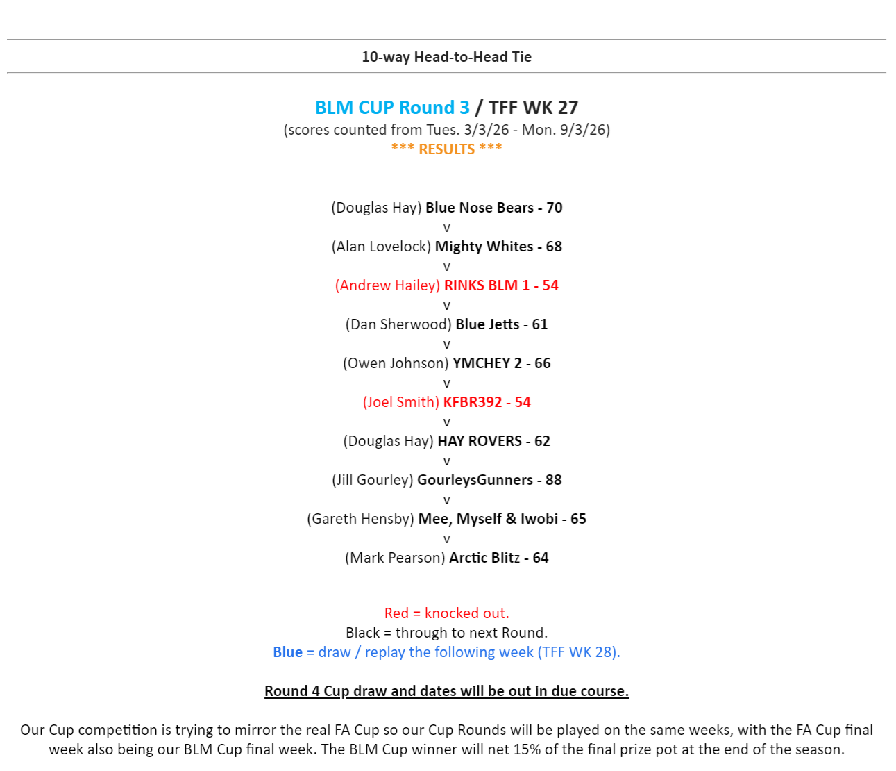 The ‘BLM’ CUP competition. Every team entered into the ‘BLM PREMIERSHIP’ Super League will automatically be entered into the ‘BLM’ CUP. All the teams in the ‘BLM PREMIERSHIP’ before the real FA Cup 3rd Round starts will be entered into a random draw. I use Draft Logics Cup Fixture Generator for this (Cup Fixture Generator) and screen record the cup draws to show all is random and above board. I then post the video on The Fan Pub forum so anyone can watch the draw there. Those who I have an e-mail address for will be sent a link to each rounds draw video when I publish it at TFP forum. The Cup will work on a knock out basis. I will produce a list of the ties and e-mail this out to everyone in the league (I have an e-mail address for) so you can see whom you’re up against. For this reason, do keep me advised of your current e-mail address if you’re a new player to my Super League or have changed it since last season (or if you did not get e-mails last season - as that means I do not have your e-mail address saved in my mailing list group for this league so please tell me to add you).