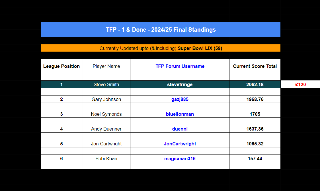 Well played Steve Smith (stevefringe) - you played a blinder this season and bested everyone netting a £120 (WTA) prize pot!