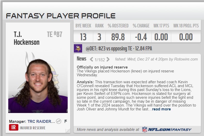 x1 Started TE - T.J. Hockenson - (MIN) who was put on IR before his teams actual game day: