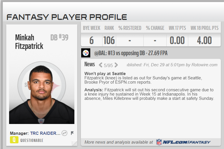 (LC) There is no way for me to excuse this with the player being officially ruled out Friday morning and his teams game not to Sunday. This is Thomasâs first strike this season so should he not make a another infraction it will wipe off in the off season to restore him to a clean record for next season. Let this be a reminder to all to keep checking your starting line ups especially on game days to pick up things like this and adjust.